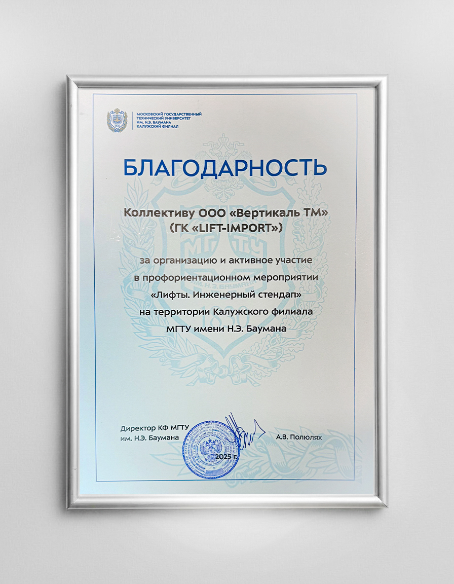 Рады поделиться: по итогам образовательного мероприятия «Лифты. Инженерный стендап» в Калужском филиале университета наша команда удостоена официальной благодарности за организацию и активное участие. Такой знак — свидетельство нашего вклада в продвижение лифтовой отрасли.