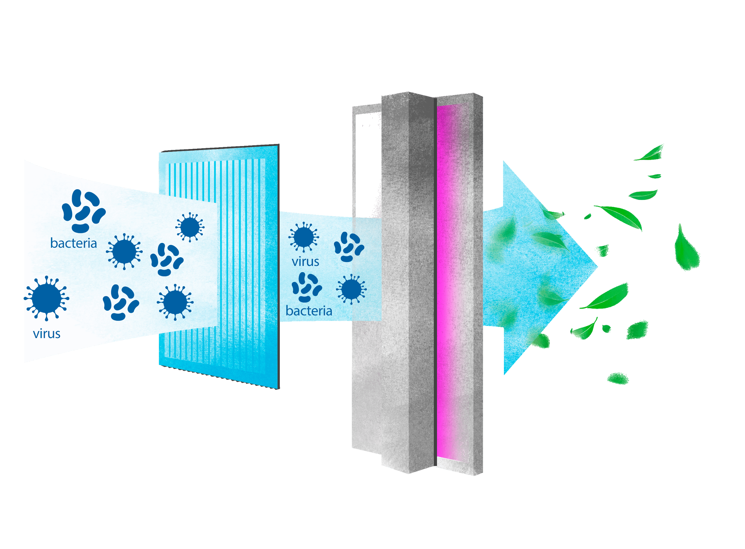 ✔ во время второй фазы воздух направляется в полностью закрытое ультрафиолетовое фотокатализаторное устройство для уничтожения бактерий. Оно исключает утечки ультрафиолета и имеет коэффициент уничтожения вирусов и бактерий, превышающий 99%.