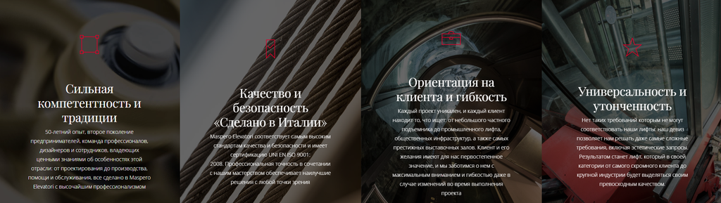 Лифты Maspero Elevatori рассчитаны на длительный срок эксплуатации. Функциональность и надежность – это принципы, которые мы оцениваем при выборе каждого компонента. Мы строим лифты с использованием лучших деталей, доступных на рынке. Мы предлагаем нашим Клиентам важное преимущество – полную доступность запасных частей, одновременно снижая затраты на эксплуатацию и техническое обслуживание.